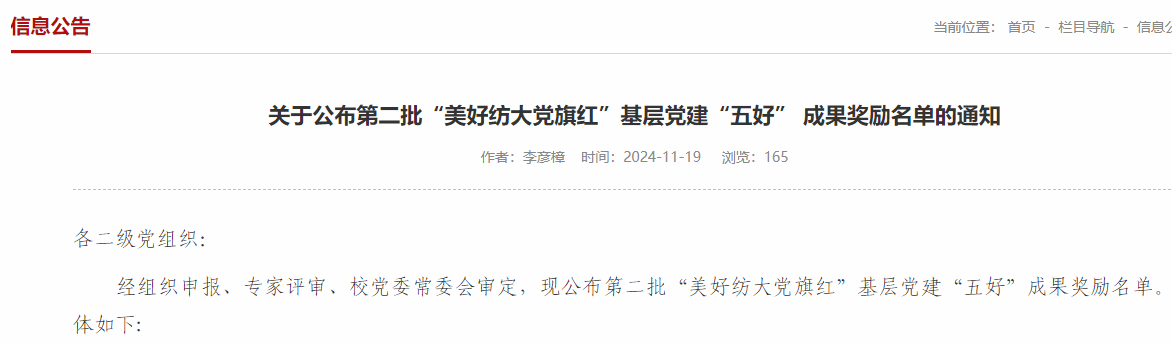 公告链接:关于公布第二批“美好纺大党旗红”基层党建“五好” 成果奖励名单的通知-澳门太阳成集团组织部(党校) https://zzb.wtu.edu.cn/nr.jsp?urltype=news.NewsContentUrl&wbtreeid=1031&wbnewsid=4182