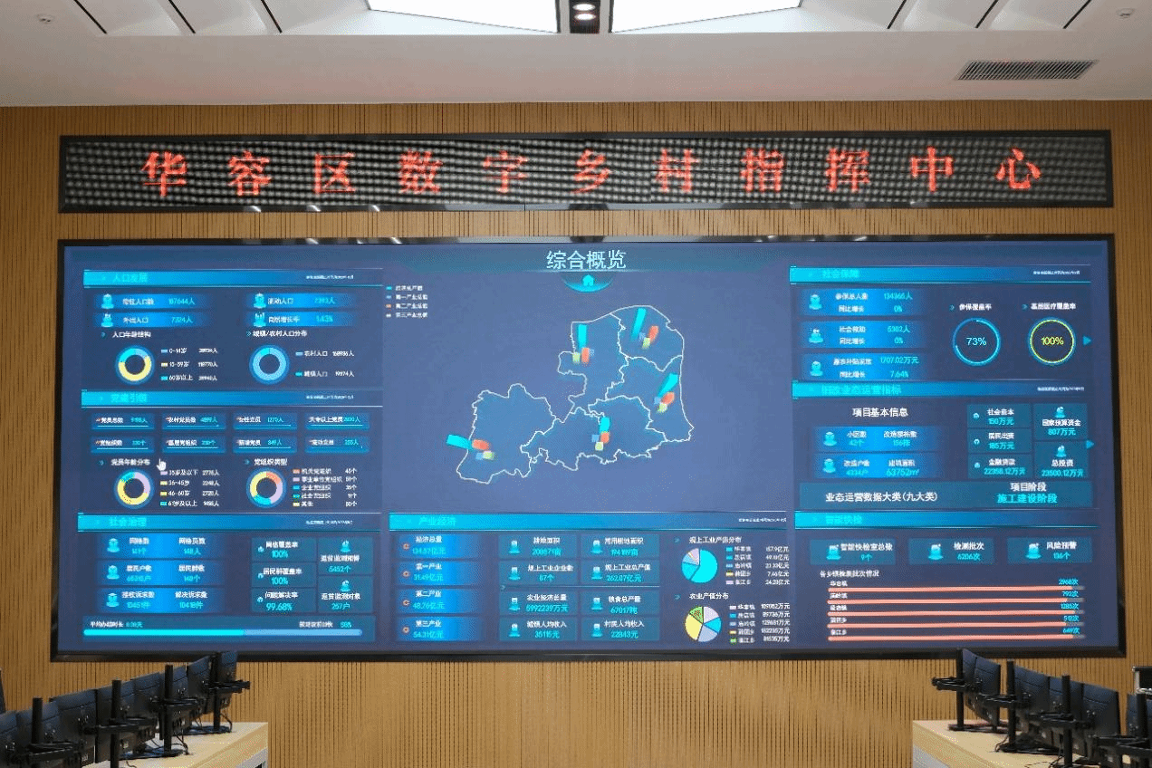 工作人员通过华容区数字乡村指挥中心大屏向团队成员们展示了华容辖区总面积等信息,通过大屏成员们直观地看到党员各类分析数据,党员信息一应俱全、实时更新,党员新闻动态及时准确,以数字赋能党建增强基层党组织政治功能和组织功能,切实落实了以抓党建促乡村振兴的要求。