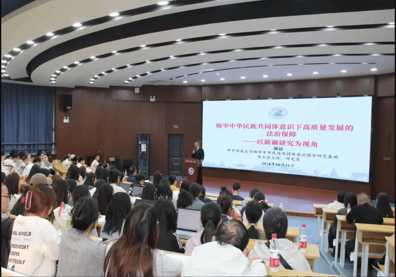 滕锐详细介绍了华中科技大学铸牢中华民族共同体意识研究基地的概况和现状,作为由中央四部委(中央统战部、中央宣传部、教育部、国家民委)联合设立的首批铸牢中华民族共同体意识研究基地,研究方向聚焦,特色鲜明,成果丰厚。滕锐依托华中科技大学与石河子大学深度交流合作的丰硕成果,凭借深厚的学术底蕴、切身的鲜活案例、独到的研究视角,从全面落实推进中华民族共有精神家园建设、推动各民族共同走向社会主义现代化、促进各民族交往交流交融、提升民族事务治理体系和治理能力现代化水平以及坚决防范民族领域重大风险隐患等五个方面深入阐述了铸牢中华民族共同体意识下高质量发展的法治保障。他表示,作为科研工作者,要心系家国、知行合一,把“调查研究”这一“大文章”做深做实,不仅要将学术研究的根深植于祖国广袤的大地上,更要将科研成果的枝蔓延伸至社会实践的广阔舞台。