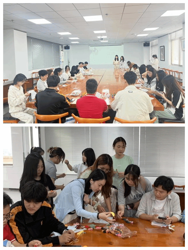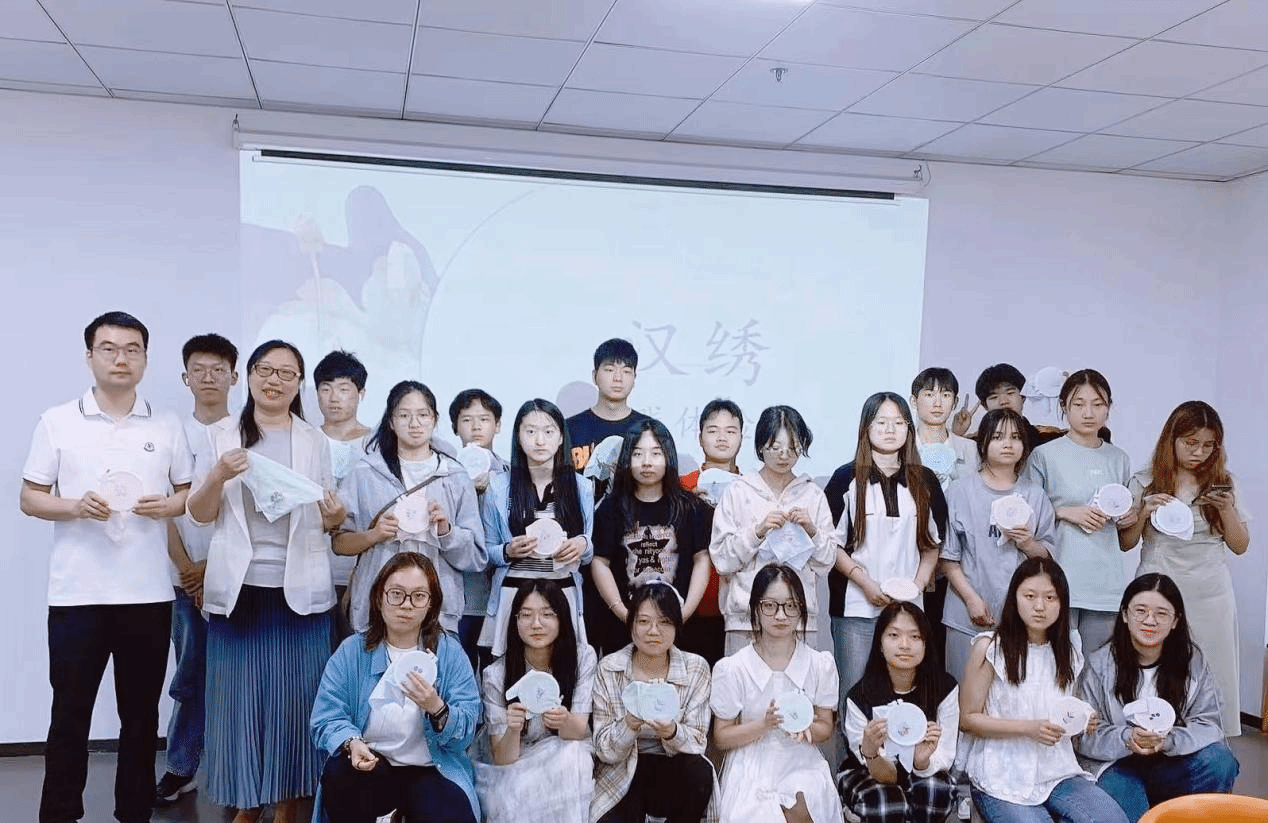 随后,非遗馆工作人员带领师生一同来到湖北省非物质文化遗产研究中心(澳门太阳成集团)进行汉绣的实践体验课。课堂上,老师为同学们分发了制作汉绣的工具包,通过现场演示、播放视频、一对一指导的方式为同学们进行汉绣技艺的传授。同学们聚精会神,一针一线紧跟着老师的步骤进行实操练习,并完成一件件精美的汉绣作品。